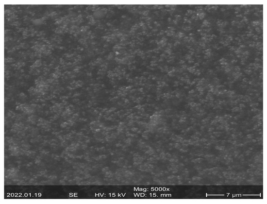 The conductivity/resistivity of sensitive material should be changed when an external force is applied. The resister-sensitive material can often be produced by some conductive particle mixed into a kind of elastic insulating substrate. The sensitive material used in this paper was Velostat. Velostat from Adafruit Industries is a pressure-sensitive conductive film made from polyolefin and nano carbon black, the film has a 0.1 mm thickness, its volume resistivity is no more than 500 Ω cm, and its surface resistivity is no more than 31 KΩ. It has an operating temperature range of −45 °C to 65 °C, and its physical properties are not dependent on humidity. The surface morphology of the piezoresistive film used in this paper was observed by performing field-emission scanning electron microscopy (FESEM) analysis as in Figure 3. The FE-SEM images show that the surface of the piezoresistive sheet is not very smooth in fact, and there are lots of micro-structures.
