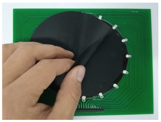 The piezoresistive film was cut into a circle with a diameter of 100 mm and fixed on a PCB with 16 electrodes evenly distributed along the circumference, which was specially designed for the EIT tests. We applied silver paste on the piezoresistive film, connected it to the electrodes on the PCB, and waited for the silver paste to cure. Since the conductivity of a piezoresistive film changes significantly in the direction of pressure and less in the horizontal direction when pressed, this means that it is difficult for the EIT system to detect conductivity changes when the sensor is pressed in a direction perpendicular to the surface of the sensor, as the current in the sensor flows in a horizontal direction. We therefore used a two-layer structure. The cured silver paste electrodes were covered with insulating material and a 100 mm diameter circular piezoresistive film was cut to cover the underlying piezoresistive film. The double layers structure of the sensor sample using the Velostat piezoresistive film is shown in Figure 4. The contact impedance between the two piezoresistive films is large when the sensor is not subjected to external forces, and when the sensor is subjected to external forces, the contact impedance between the pressed areas decreases due to the effect of the press. This translates the effect of the vertically acting force to the horizontal direction.
