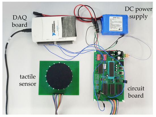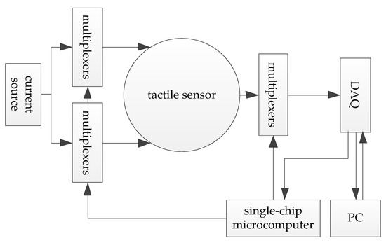 A simple circuit system was designed for sensor data acquisition, as shown in Figure 5. The positive and negative electrodes of the constant current source are connected to different multi-channel switches, which are controlled by a single-chip microcomputer and further connected to the driving electrodes of sensitive materials. Similarly, the measuring electrode that is connected to the acquisition circuit at a certain time is also controlled by the single-chip computer. The voltage difference between the measuring electrode and the negative electrode of the constant current source is taken as the measured voltage. After the signal is amplified, the data acquisition card USB-6210 of NI is used to collect and transmit it to the computer. The computer sends a square wave signal to the acquisition card every certain time and transmits it to the single-chip microcomputer through the acquisition card. Adopting adjacent driving mode, the system switches the multiplex switch to the adjacent electrode for measurement when the level of square wave signal changes was detected by a single-chip microcomputer. The voltage differences saved by the computer are the measured voltage, which is then processed into the voltage differences between adjacent electrodes. The whole actual system of the proposed tactile sensor is shown in Figure 6.