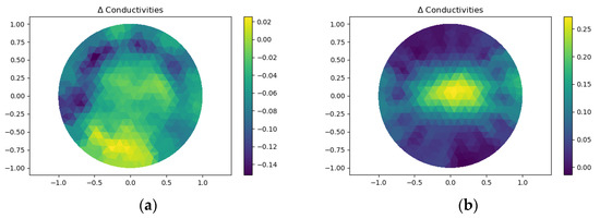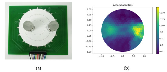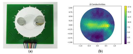 Figure 18a showed two 100 g weights placed on specified points belonging to two different circles with a radius of 20 mm and 35 mm, respectively. Figure 18b showed the reconstructed images. It can be seen that the closer the contact point was to the edge, the more obvious the change of conductivity was.
