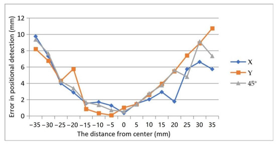 In order to get to know the accuracy of positional measurement in different areas over the whole sensor, as shown in Figure 9, a 100 g weight was placed on the double-layer structure sensor, and the weight was moved by a step of 5 mm with the direction of horizontal, vertical, and 45°, respectively. The actual coordinates of the weight are compared with the centroid coordinates calculated by OpenCV demonstrated above.