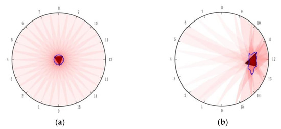 The error in positional detection was defined as the Euclidean distance between the actual coordinates of weight and the centroid coordinates of the reconstructed image detected by OpenCV. Figure 10 showed the diagram of the detected error. The errors were symmetrically distributed about the center of the detective region. The error achieved a minimum around the center area and increased with the distance from the center. The reason was inferred as follows. The reconstructed image was a composition of all 16 back-projection images under different driving electrodes. Figure 11a,b showed that the back-projection was projected to the middle region evenly, but to the fringe region unevenly. The EIT imaging algorithm is more sensitive to locations close to the electrodes than to locations far from the electrodes where small noise can lead to greater errors. The maximum absolute errors shown in Figure 10 do not exceed 11 mm, all within the circular domain of the loaded weights, which is the circular domain with a radius of 11.5 mm, indicating that the accuracy of the positional detection of the sensor described in this paper can meet the requirements of human–machine interaction.
