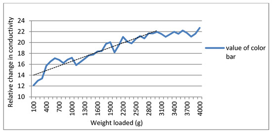 Different pixel values represent different degrees of conductivity change in a reconstructed image. A bigger load leads to a more obvious change in conductivity, which means a higher pixel value. Thus, a corresponding relationship between the magnitude of external pressure and the relative change in conductivity can be founded. Figure 12 shows three different weights stacked together, which ensure the contact area remains unchanged. Under a fixed contact area, weights from 100 g to 3900 g were loaded over the sensor. Figure 13 shows the curve demonstrating the relationship between the magnitude of weights and the relative change in conductivity in the reconstructed image. In general, the value increased with the mass of the weight, and it is an approximate linear relationship during a certain range, this shows that the EIT method can be used to identify the relative magnitude of the pressure. As weight increases, the curve tends to be flat, which means the change of conductivity was close to its limit.