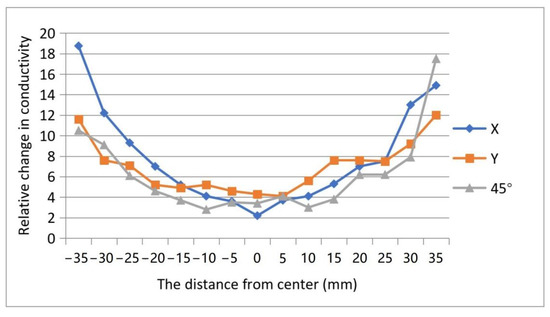 In order to get to know the sensitivity of pressure detection in different areas over the whole sensor, the same weight was moved in three directions similar to the condition demonstrated in Figure 9. The relative change in conductivity with the weight in different places was shown in Figure 14.