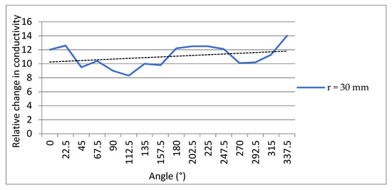 Figure 16 showed the result of a different measurement point. It can be seen that the relative change in conductivity of different points around a circle was at roughly the same level. This indicates that the same relative change in conductivity at the same distance from the center of the detection region can indicate the same pressure. The pole diameter of the press position has an effect on the relative change in conductivity, and the larger the pole diameter, the greater the rate of change, while the pole angle has almost no effect on it. Therefore, the distance between the target position and the center of the detection area should be considered when the relative change in conductivity is used to express the force magnitude.