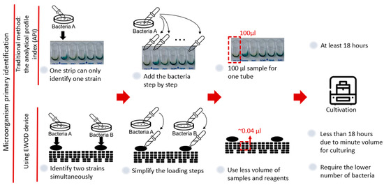 Using the results presented above, we confirmed that the integrated use of EWOD and API can indeed detect a single unknown colony. We found that it is unnecessary to enlarge an isolated colony by placing it on another solid medium and culturing overnight. Utilizing the EWOD system can thus decrease the time needed and simplify the steps required for bacterial identification, as shown in Figure 8.