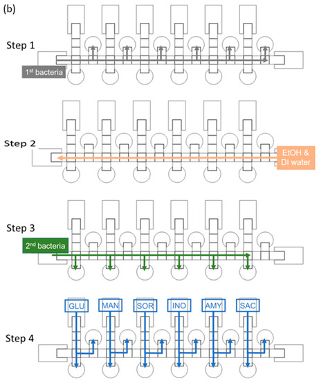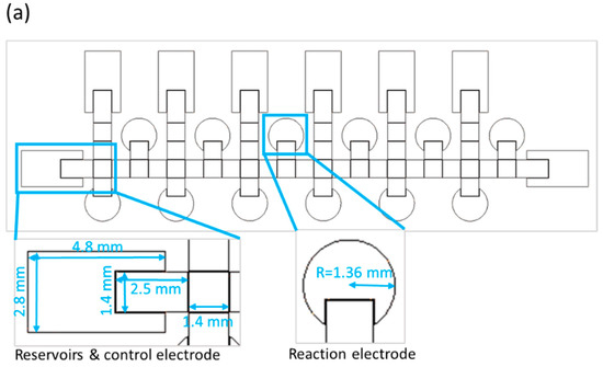 The size of a single chip is 78 mm × 28 mm. The chip contains reservoirs, control electrodes and reaction electrodes—the dimensions for which are shown in Figure 2a. Because the number of switches in our EWOD system is limited to 64, we designed some electrodes to be controlled with the same switch, and only one electrode way for two distinct bacterial species. We thus used alcohol and deionized water to clean the way of the control electrodes before loading a second strain, as shown in Figure 2b. Loading the first bacterial solution in the left side reservoir is first operational step of identification of bacteria on the EWOD chip, and switches the corresponding electrodes by LabView to generate six bacterial droplets and move each of them to upper-reaction electrodes. As mentioned above, we used alcohol and deionized water to disinfect the movement path for the bacterial solution. In the third step, another bacterial solution was added and the first step was repeated, but each droplet was moved to the lower reaction electrodes. Finally, as illustrated in Figure 2b, the six reaction reagents were generated by voltage control, moved to the corresponding reaction electrodes and placed in different reaction electrodes to mix with the bacterial solution and analyze the color change through ImageJ at 16 h.