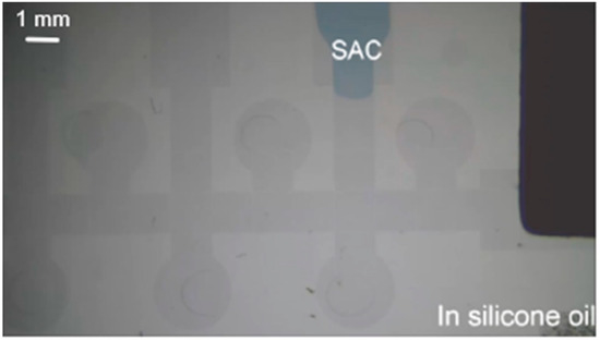 We used sterilized DI water (50 µL) to redissolve the reagents, and referred to the label in the kit to obtain the reagents with concentration 38 µg/µL. The six reagents were tested for creating, transporting, cutting and merging in air or an oil bath on the EWOD chip. The experiments showed that the lowest voltage for the formation of droplets in air is greater than in the oil bath. The higher the operating voltage, the greater the rate of chip damage. Furthermore, driving the droplets in the silicon oil environment can decrease the rate of evaporation of the reagents. Considering that the subsequent reagents must be cultured after mixing with the bacterial liquid for at least 16 h, we decided to operate in an oil bath afterwards. The test showed that the best operating voltage and frequency are 40 V and 1.5 kHz, which can move the droplets smoothly without causing dielectric breakdown.