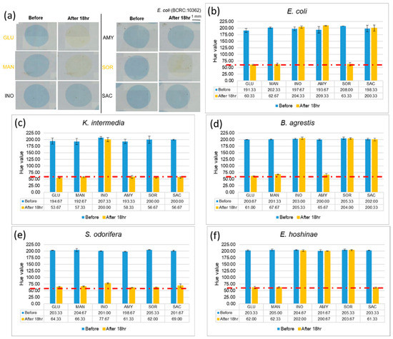 Figure 4. Results of cultivating selected Enterobacteriaceae at concentration 105 CFU/µL. (a) Comparing E. coli images before and after culturing. (bf) Changes of hue after 18 h indicate that different bacteria use different sugars. (Red dotted line indicated the threshold line at Hue value equal to 60).