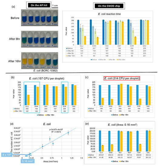 Figure 5. Advantages of combining API with an EWOD technique. (a) Reaction duration required on the kit and the chip. (b,c) Data of number of E. coli for identification. Dotted line indicates that the Hue value of these three mixtures, which supposed be positive reaction, did not approach 60. (d) Number of bacteria in a single colony. (e) Results of E. coli detection with single colony.