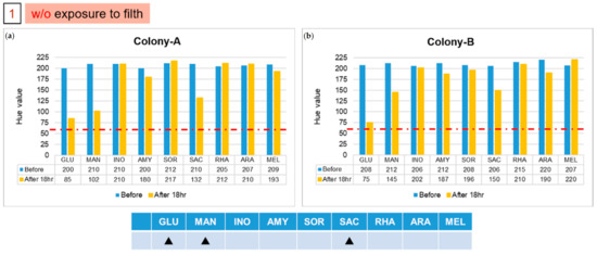 Figure 6. Results of two isolated colonies, (a) Colony-A and (b) Colony-B, in the first group with experiments on chips. The solid triangle symbol indicates that this unknown strain does not use the corresponding sugar in large quantities, so the hue would not change to 60. (Red dotted line indicated the threshold line at Hue value equal to 60).
