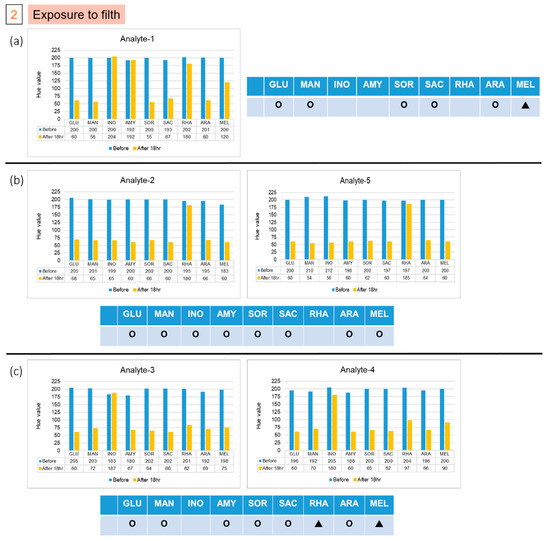 Figure 7. Results of five isolated colonies in the second group, (a) Analyte-1, (b) Analyte-2 and Analyte-5, and (c) Analyte-3 and Analyte-4, which was in contact with filth, from the experiments on the chips. (Hollow circles means Negative; filled triangles means Positive; and Red dotted line indicated the threshold line at Hue value equal to 60).