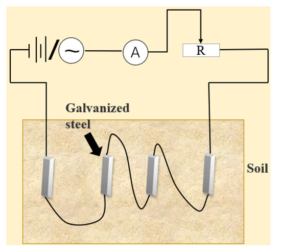 Grounding grids are important to ensure the safety of current transmission. When short circuits are caused, they have the function of maintaining voltage balance and releasing electric current [1,2]. Galvanized steel has been widely used as a kind of material for ground grids in power grids and for power plant equipment [3,4,5]. However, galvanized steel will be buried in the soil and electrified due to the working conditions of power systems, which will speed up the corrosion of the galvanized steel, causing it to be damaged [6,7]. When the galvanized steel of the grounding grid fails due to corrosion, the current cannot be spread to the earth in time. In this case, the equivalent resistance and potential of the soil increase greatly, and the voltage in the secondary circuit also increases correspondingly, resulting in the failure of the transmission line, even endangering human safety and causing major safety accidents and huge economic loss [2,3,8].