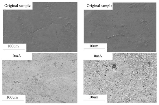 At high magnification (the magnifications is 1000), it can be seen that under the AC current, the galvanized steel will preferentially form an oxide film to protect the zinc layer from damage (Figure 2b), under the DC current, no oxide film formation is observed. Under the AC current, the oxide film of galvanized steel sample is gradually destroyed with the increase of current, forming porous and loose surface, and finally forming surface cracks. Under the DC current, there are no obvious corrosion products on the surface, and the corrosion surface is smoother than that under the AC current.