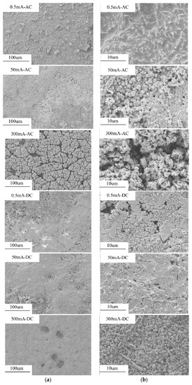 The results of the SEM are shown in Figure 2. At low magnification (the magnifications is 100), the aperture of small pits on the surface of galvanized steel will gradually increase with the increase of current. Under the DC current, individual and large craters form on the sample surface. Under the AC current, dense pores form on the surface of the sample. As the current increases, the holes gradually form a series of cracks as shown in Figure 2a.