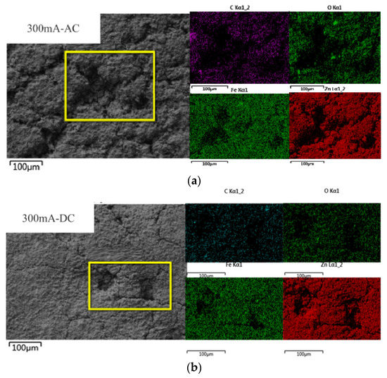 The results of element analysis of galvanized steel. (a) 300mA-AC, (b) 300mA-DC.