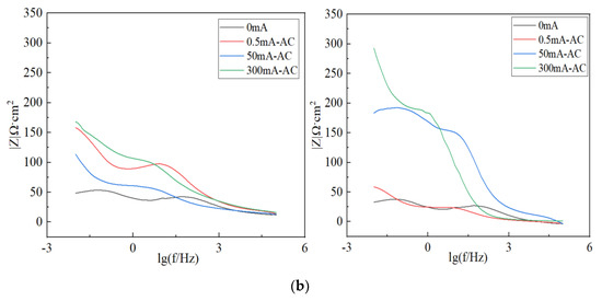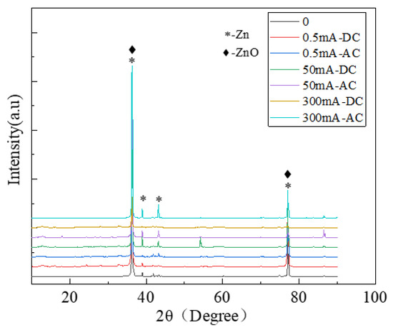 From EIS we can find: Under the AC current, the radius of capacitive loop is much larger than that of the sample in 0 mA currents, indicating that electrified with AC current can accelerate the formation of oxide film and hinder electron transfer. Under the DC current, the corrosion products on the electrode surface increase, and a relatively dense oxide film is formed on the electrode surface, which slows down the diffusion of the corrosive medium. The larger DC current, the more obvious the phenomenon; accordingly, the radius of capacitive loop becomes larger and larger. It indicates that electrification with DC current can significantly accelerate the degree of galvanized steel corrosion. The radius of the capacitive loop of a DC power supply is much larger than that of an AC power supply under the same current size. In the Bode diagram, the impedance amplitude increases gradually as the current increases, which can also confirm the above conclusion. Considering the corrosion rate, macroscopic diagrams, and SEM, it was found simultaneously that: under the same current type, the corrosion degree of galvanized steel increases with the increase of current, especially in the case of a DC power supply; under the same amount current, the corrosion degree of galvanized steel connected to a DC power supply is greater than that of an AC power supply, and we explained the mechanism. In addition, the XRD patterns show that the corrosion products of galvanized steel are ZnO.