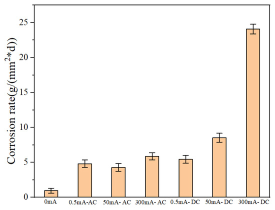 The weight loss rate can directly and effectively reflect the corrosion degree of the sample. Table 3 shows the weight loss rate of the seven groups of specimens buried in the experimental soil after two weeks. The weight loss rate was plotted as the weight loss rate graph, as shown in Figure 5. From this figure, we can intuitively find that current can significantly increase the corrosion rate of galvanized steel. This phenomenon exists in both DC and AC current. The weight loss rate of galvanized steel increases obviously with the increase of DC current.