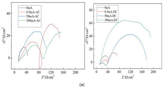 In order to further investigate the corrosion behavior of galvanized steel, electrochemical impedance test was carried out on the corroded samples. The results are shown in Figure 6. Under the AC current, there are two capacitive loop in the Nyquist figure in 0.5 and 300 mA currents; the radius of capacitive loop is much larger than that of the sample in 0 mA currents, indicating that electrified with AC current can accelerate the formation of oxide film and hinder electron transfer. Under the DC current, there are also two capacitive loops in Nyquist figure in 0.5 and 50 mA currents; with the increase of DC current, the radius of capacitive loop becomes larger and larger, indicating that electrified with DC current can significantly accelerate the degree of galvanized steel corrosion. The capacitive arc diameter of DC power supply is much larger than that of AC power supply under the same current size.