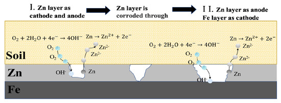 Galvanized steel in the soil suffers mainly electrochemical corrosion under the influence of electric current. Galvanized steel with different potentials forms a loop through the corrosive soil medium. The negative polar part of galvanized steel acts as the anode to dissolve zinc layer. The positive polar part is used as the cathode for oxygen reduction reaction [5,25].