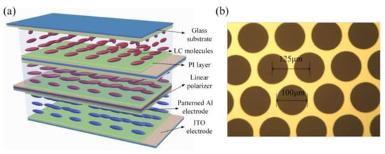 The key functional structures of the LCMLA are both ~500 μm glass substrates with different conductive film pre-coated over their inner surfaces. The inner surface of the bottom substrate is deposited with a planar ITO electrode of 185 nm thickness, and that of the top substrate deposited with an aluminum (Al) electrode of 100 nm thickness, according to the common magnetron sputtering. After conventional ultraviolet photolithography and the wet-etching process, the patterned Al electrode with arrayed micro-holes is formed. To improve the utilization efficiency of incident light beams, a patterned micro-hole with a hexagonal period is used to replace the previous quadrilateral period, which means that the filling factor of the formed LCMLA can be increased from ~50.27% to ~58.04%. A partial patterned Al electrode is illustrated in Figure 1b. As it is shown, the diameter of each micro-hole is 100 μm and the center-to-center distance is 125 μm. Similarly, the polyimide layer is also further spin-coated on both the patterned Al and planar ITO electrodes of the LCMLA, and then also prebaked for 10 min at 80 °C and cured for 30 min at 230 °C over a hot plate, sequentially. The cured polyimide layers on the patterned Al and planar ITO electrodes act as an initial alignment layer of LC molecules, which are rubbed anti-paralleled to each other so as to homogeneously align the LC molecules filled later. To satisfy the polarization sensitivity, the initial orientation of LC molecules should be parallel to the transmission axis of the linear polarizer used. Glass microsphere spacers of 20 μm diameter are also mixed with the adhesive and then deposited over a surface of a glass substrate to separate two substrates and shape a micro-cavity. Finally, a layer of LC materials (E44 of Merck) is fully filled into the shaped microcavity to construct the LCMLA architecture.
