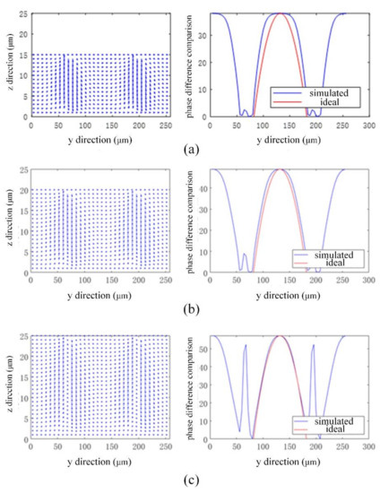 Figure 3 show the simulated LC director distributions along the blue dotted line in Figure 2, and the phase retardation difference comparison with the ideal profile corresponds to 15 μm, 20 μm, and 25 μm, respectively. As it is shown, when the thickness of the LC cell is 15 μm, the generated phase retardation difference is quite different from the ideal phase retardation difference curve; therefore, its imaging capability is judged to be insufficient. When the thickness of the LC cell is 25 μm, the phase retardation difference in the center is nearly closed to the ideal phase retardation distribution. However, with the increase in the thickness, the LC molecules under the electrode pattern exhibit serious disclination, thus resulting in an uneven phase retardation difference, which will affect the stability of the LC cell. On the other hand, when the thickness of the LC cell is 20 μm, the retardation difference distribution is very closed to the ideal retardation difference, and the disclination phenomenon in an acceptable range compared with that of 25 μm. Therefore, the 20 μm thickness is chosen as the designed thickness. Moreover, according to the simulations, the interaction between holes does not influence the LC director distribution as well as the phase retardation redistribution. Therefore, the designed hexagonal-lattice hole pattern and the cell thickness of 20 μm are determined.
