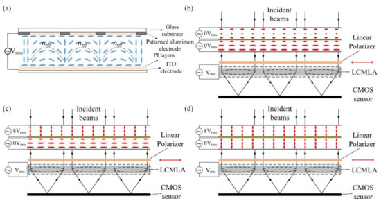 The TNLC cell is an effective broadband polarization rotator which has been widely used in LC displays. The typical milestones are as follows. The operating principle was firstly published by M. Schadt and W. Helfrich [24]. The mathematics concerning the twisted nematics were derived by D.W. Berreman [25]. The operating principle of the planar-aligned positive dielectric nematics was published by M. F. Schiekel and K. Fahrenschon [26]. Those previous studies demonstrate that a beam of specific polarized light wave can be obtained from unpolarized light wave via TNLC/polarizer combination [18,27,28,29]. Under the condition of no external signal voltage being applied or in the off state for each TNLC cell with a 60° twist configuration, the polarization of incident beams are rotated by 60°. When an appropriate external signal voltage is applied, the initial beam rotation disappears. Therefore, three different polarization states such as I0, I60, I120, can be obtained by applying a set of suitable signal voltage. The LCMLA is another key component of the proposed plenoptic camera. Recently, the LCMLA-based plenoptic cameras have attracted a lot of research interests [30,31] owing to several obvious advantages including easy integration with other functioned structure or devices, 2D/3D switchable mode, ease of fabricating [32,33], and the excellent tunability with driving electric field applied [34,35,36,37,38]. In addition, the previously proposed the micrometric LC bubbles do not require the patterned electrode and thus remarkably improve the optical resolution of the LCMLA [39]. In the plenoptic camera proposed by us, the LCMLA is used to form the needed imaging light fields of the targets and scene. The configuration schematic of the CTNLC cell and the LCMLA coupled with an arrayed CMOS sensor is given in Figure 4. As shown in Figure 4a, a gradient refractive index distribution corresponding to the extraordinary beams can be formed so as to result in an effective beam converging towards the focal point, when an appropriate signal voltage is applied on the LCMLA. Generally, the focal length can be easily adjusted by tuning the root mean square (RMS) value of the signal voltage applied. The black dash line indicates a typical equivalent reflective index distribution profile. Several typical states formed by orderly cascading the CTNLC cell and the LCMLA with featured LC arrangement for recording three different polarizations including I0, I60, I120, are shown in Figure 4b–d. The direction of small red arrows represents the light wave transmission direction of the linear polarizer.