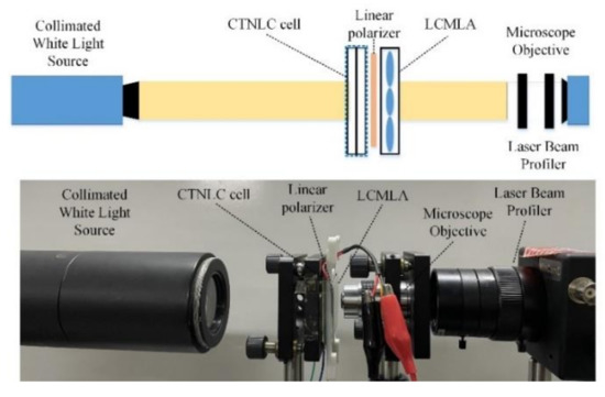 To quantitively evaluate the performance of the key CTNLC cell and the LCMLA constructed, two basic parameters of the point spread function (PSF) and the focal length of the developed devices are measured according to a common measurement system, as shown in Figure 5.
