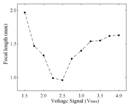 The relationship between the focal length of the LCMLA and the RMS value of the signal voltage applied over the LC device is demonstrated in Figure 7. According to our experiments, the current LCMLA can be driven normally in the voltage range from ~1.5 Vrms to ~4.0 Vrms, which is a very favorable factor for constructing the electrical driving and the adjusting system. The realized focal length is in a range from ~0.96 mm to ~1.97 mm, which can be tuned easily so as to present an excellent tunability under the condition of a low signal voltage level. In general, the focal length dependence on the applied signal voltage of a LC microlens exhibits a non-monotonic behavior, that is, it will firstly decrease and then increase with increasing the voltage signals applied. The reasons are already explained in detail in previous research [43].