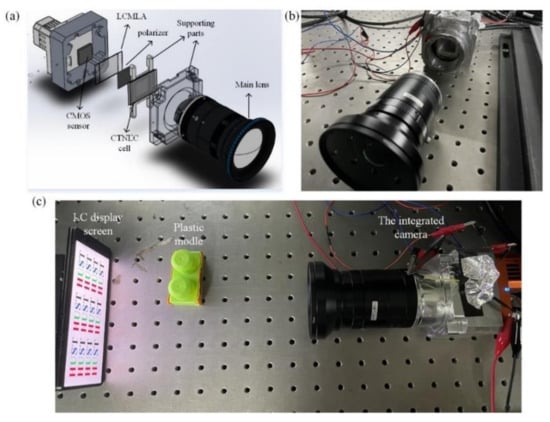 Figure 8 demonstrates the typical characters of the proposed prototyped camera. The schematic diagram of the prototyped camera with needed structural configuration is shown in Figure 8a. The main lens and the imaging optical aperture of the proposed camera are shown in Figure 8b. The imaging measurements scene is illustrated in Figure 8c. As shown, the proposed plenoptic camera consists of a CMOS sensor (IMX342 of Sony, Tokyo, Japan) and a CTNLC cell and a LCMLA. A main lens of LF2528M-F with a focal length of 25 mm is used to collect the target radiations. By using computer numerical control machining and 3D printing technology, the above components are fabricated and integrated into a hand-held prototyped camera. The resolution of the CMOS sensor array is 6464 × 4852 and its pixel pitch is 3.45 μm. Both the dynamic range and the signal-to-noise ratio (SNR) are 73 dB and 40 dB, respectively, so as to enable high contrast images. The distance between LCMLA and the CMOS sensor is set as ~1.1mm. The F-number of the main lens is set to match the LCMLA so as to insure a relatively full use of the resolution of the CMOS sensor and further avoid the crosstalk between sub-images. To demonstrate the polarimetric imaging application, a plastic model car and a LC display screen of 5.99 inch are selected as targets. The model car and the LC display screen are placed 100 mm and 210 mm away from the prototyped camera constructed, respectively.