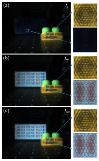 The raw light field images with three polarization states of I0 and I60 and I120 captured by the prototyped camera developed by us are respectively shown in Figure 9a–c. Both partial enlarged images of the model car and the LC display screen are demonstrated on the right in each subfigure. The pixel resolution of the enlarged part of two letters “e” and “H” are, 237 × 236 and 243 × 253, respectively. Each TNLC cell is turned to “on state” by applying a signal voltage of ~8 Vrms, and that of applied on the LCMLA is ~3.5 Vrms. The polarization direction of the linearly polarized light emitted by the LC display screen is 90°, and its components in both the 60° and 120° directions are almost the same; therefore, there is no obvious difference between Figure 9b,c. This can also be observed from Figure 9a, where the position of the LC display screen is almost black.