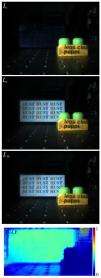where DoLP is between 0 and 1. For completely linearly polarized light DoLP = 1 and for unpolarized light DoLP = 0. It is worth mentioning that when the circularly polarized component S3 is considered, due to a relatively long exposure time of image acquisition process, it is equivalent to increase the same value in I0, I60, and I120. According to Equations (1) and (2), the calculated S0 is larger than actual value, whereas S1 and S2 are the same as the actual value due to the subtraction of the calculation. Thus, the calculated DoLP value is less than the actual value for each pixel, with an exception, i.e., when DoLP is 0, the calculated value is the same as the actual value.