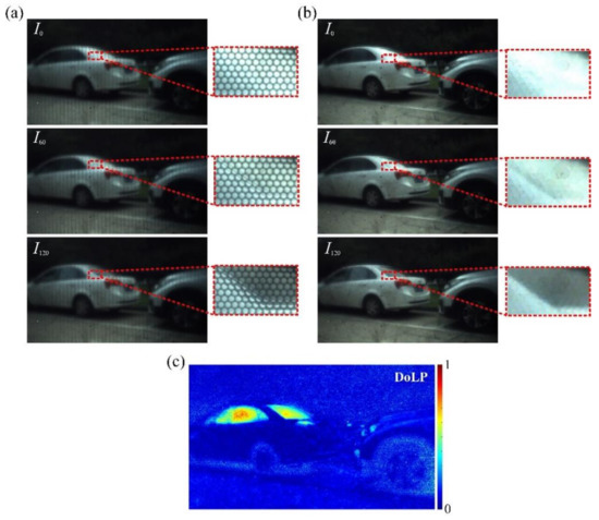 As shown, both the side and rear windows of the car are strongly exhibited by the all-in-focus DoLP images. When its windows are selected as a target, the related images with different polarization states including I0 and I60 and I120, can be captured by the proposed imaging architecture. Through electrically tuning the polarization state mentioned, the strongly reflected sunlight of the windows can be effectively suppressed, so as to outstand their morphology and outline characters for easily performing graphic information processing. Another typical outdoor imaging measurement is shown in Figure 12. The captured raw light field images and the rendered all-in-focus images with three polarization states are illustrated in Figure 12a,b, respectively. For the captured raw light field images in Figure 12a, the pixel resolution of the enlarged parts is 334 × 401, and that of the rendered all-in-focus images shown in Figure 12b 84 × 100, which also indicates the loss of spatial resolution due to the refocusing process. The calculated normalized all-in-focus DoLP image is demonstrated in Figure 13.