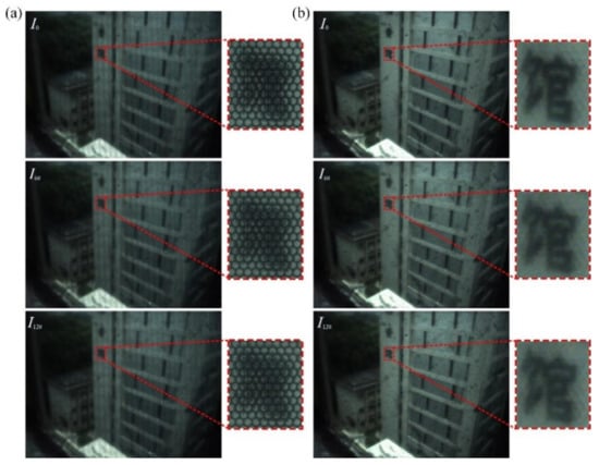 The visibility enhancement in scattering medium is realized through two methods basically, as shown in Figure 15. For comparison, the imaging characters corresponding to the polarization state of I60 are also shown in Figure 15a. The first method is to restore target features by calculating the grayscale DoLP, as shown in Figure 15b. The second method is to remove the visual effects of the scattering medium by the polarization-difference (PD) information. In the experiments, two patterns with typical polarization states of I60 and I0 are selected as input images. The PD-based recovered image is illustrated in Figure 15c, the detailed process of which can refer to Ref. [44].
