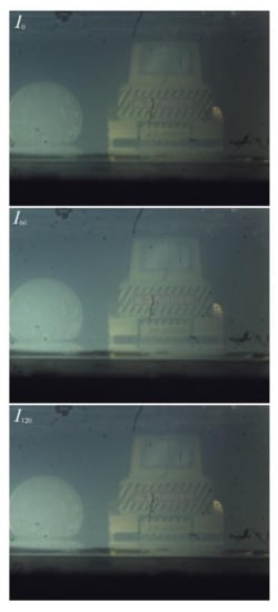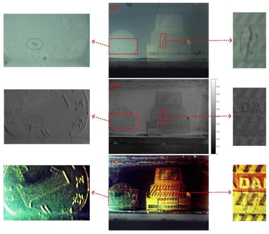 In the scattering medium, both the sharpness and the contrast of the optical images usually suffer degradations, as shown in several typical situations such as conducting imaging detection through haze, or performing underwater imaging [44,45,46]. Many previous studies revealed that the imaging quality in the scattering medium can be effectively improved by polarization information. In this section, two different polarization-based methods are employed for remarkably enhancing the imaging quality in the scattering medium. A typical scattering medium circumstance is constructed by adding five drops of whole milk to a 10 cm × 5 cm × 6 cm water tank full of pour water. The constructed water tank is placed on an optical table and a LED photography light that emits diffuse white light is used as the illuminating source to simulate natural light. A coin and a yellow model dozer are placed behind the water tank as targets; nothing is placed elsewhere in the field of view. During measurements, the LCMLA is removed for obtaining an imaging effect with more intuitive vision and also avoiding the block effects as a kind of imaging noise introduced by re-focusing operation. Similar to the experiments in above section, 2D light intensity images with three polarization states of I0 and I60 and I120 are captured by the proposed LC-based imaging system, as shown in Figure 14. As shown, the image in the water tank region exhibits visual whitening effect, which is caused by the backscattered light of the constructed scattering medium. In fact, the backscattered light is the most important factor causing image degradation in scattering media, generally.