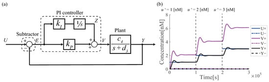 Figure 1a shows the block diagram of the whole system. Based on the above results, the subtractor and PI controller can be realized by integrating the integrator (5)∼(6) and adder reactions (12)∼(14), where the proportional gain is implicitly included in the reaction process of the adder. The controlled plant is given by the 1st order lag element as a toy example. The corresponding ordinary differential equations of the whole system is summarized as follows: