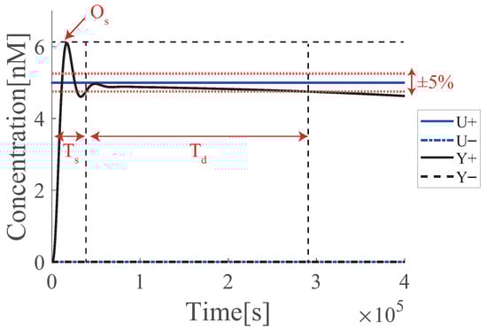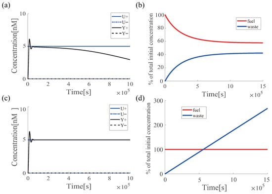 When the PI controller described in Section 3.2 is given 5 nM of input as a target concentration and driven for s, the output tends to follow the target concentration initially (e.g., < s), but it gradually moves away from the target concentration over time (Figure 2a), which is known to be “finite-time regulation” []. The total amount of fuel strands existing in the reaction system continues to decrease (Figure 2b), which is the main contributor to undermining the tracking capability. In a hypothetical simulation setting in which fuel strand consumption does not occur (Figure 2d: red line), the regulation performance is maintained during the simulation period (Figure 2c).