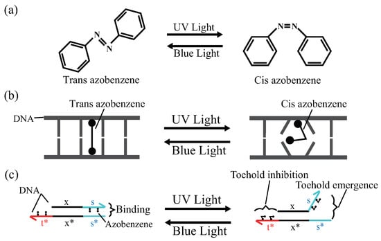 To make the PI controller renewable, a renewable design of a DNA reaction system using the photoresponsive molecule, azobenzene, proposed by Song et al. [] was applied (Song et al. made the seesaw gate renewable). Azobenzene has two structures (trans and cis forms) that can be converted into cis and trans forms under ultraviolet (UV) and blue light (BL) irradiation, respectively (Figure 3a) []. By applying azobenzene modification within the DNA base sequence, the stability of the double-helix structure can be controlled by light irradiation; the trans form under BL irradiation stabilizes the double-stranded structure, whereas the cis form under UV irradiation destabilizes the double-stranded structure (Figure 3b). This basic property of azobenzene is applied to DNA strand displacement reactions. By applying azobenzene modification to the toehold domain, it is possible to control the flow of the reaction process by switching the binding affinity of the toehold domain by light irradiation (Figure 3c). In “toehold inhibition”, the number of bases in the toehold is decreased by sequestering the toehold with azobenzene. In “toehold emergence”, the number of bases in the toehold is increased by tearing off the double-stranded structure.