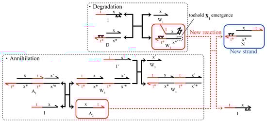 The renewable design was applied to the degradation reaction as an example. Figure 4 shows the degradation circuit with azobenzene attached and the original annihilation circuits. Briefly, the degradation circuit generates the output strand (single-stranded DNA) and the waste strand (double-stranded DNA) upon input I, wherein the azobenzene-modified gate D is prepared. The annihilation circuit annihilates two inputs I and through the two DNA strand displacement reactions while generating the waste strands , , , and . In this case, it is necessary to attach azobenzene to the recognition domain x. Then, azobenzene causes a toehold to appear and react with strand , to create a new strand N that cannot revert to the original strand.