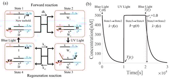 To overcome this problem, domain s is added to some DNAs [] in contrast to the two-domain implementation by the pseudo linearization method proposed in []. The reaction scheme and simulation results of the degradation circuit with azobenzene modifications (hereafter, referred to as azo-degradation circuits) are presented in Figure 5. First, when azobenzene is in the trans form, the free energy of state 2 in Figure 5a is smaller than that of state 1 in the degradation circuit because of the difference in the member of hydrogen binding relating to the toehold . As a result, the forward reaction becomes dominant. Upon irradiation with UV light, azobenzene transforms into the cis form, and the state shifts from state 2 to state 3. Then, in state 3, the toehold s is exposed owing to the destabilization of the hybridization by azobenzene, and the free energy increases, whereas in state 4, free energy decreases owing to the sealing of . Therefore, the state shifts from a high free-energy state 3 to a low free-energy state 4. Then, upon irradiation with blue light, the state returns from state 4 to state 1, and the circuit returns to its original state. As a result, the concentration is completely recovered, which satisfies Definition 2 with . Other renewable circuits for the annihilation and catalysis circuits are shown in Figure A1, Figure A2 and Figure A3.