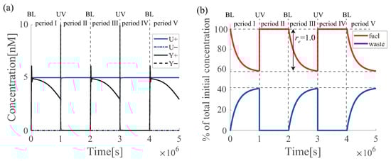 The simulation results of the renewable azo-PI controller are shown in Figure 6, where UV and BL are alternately irradiated at regular intervals, which are designated as I∼V, respectively. In period I, azobenzene exists in the trans form, and the DNA circuit functions as a PI controller, although the regulation performance of the output to the target gradually degrades (Figure 6a) as the fuel strands decrease with time (Figure 6b). The concentration is recovered in period II by applying UV to make it cis-azobenzene, and each DNA strand returns to its initial state. Then, with the BL irradiation at III, the output Y with the same trajectory as that from period I appear. Figure 6b shows the ratio of fuel DNA and waste DNA to the total initial concentration. Fuel DNA decreased with time, whereas waste DNA increased as the fuel DNA decreased. UV irradiation in period IV restored the concentration to the initial state while waste DNA decreased. The concentration is completely recovered and , which satisfies Definition 2. Because the azo-PI controller follows Definitions 2, the PI controller becomes renewable owing to the attachment of azobenzene. In addition, the azo-PI controller can be reused many times by using azobenzene because the circuit can be regenerated by UV again in period IV.