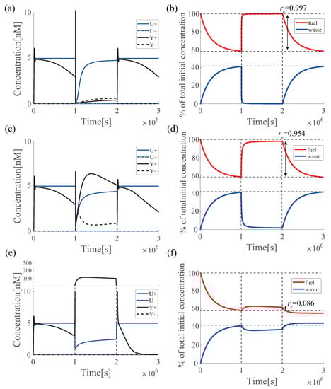 Performance and fuel DNA renewable of azo-PI controller at each effectiveness value of azobenzene. (a) Simulation result of performance renewable in input U (blue line) and output Y (black line); (b) total concentration of fuel(red) and waste (blue) strands when the effectiveness of azobenzene is 60%; (c) simulation result of azo-PI controller in input U (blue line) and output Y (black line); (d) total concentration of fuel(red) and waste (blue) strands when the effectiveness of azobenzene is 40%; (e) simulation result of azo-PI controller in input U (blue line) and output Y (black line); and (f) total concentration of fuel (red) and waste (blue) strands when the effectiveness of azobenzene is 20%. The reaction rates are listed in Table 1.