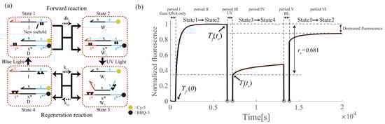 We experimentally investigated the feasibility of our renewable design using a photoresponsive control method. To reduce the occurrence of unintended reactions, such as leaks originating from azobenzene modifications, in the DNA circuit, a simpler design should be employed. Therefore, we focused on the proof-of-principle study with the azo-degradation circuit shown in Figure 9a, where the state transitions around four states (State 1 > State 2 > State 3 > State 4) are confirmed by alternating UV and BL irradiation. The base sequences of the input strand I and the gate strand D are shown in Table 1. Azobenzene was modified at six and three positions (denoted by X in Table 1) for domain s of I, domain s of the upper D, and domain t of the lower D, respectively. The experimental results are presented in Figure 9b, where the fluorescence intensities were normalized between 0 and 1, using the minimum and maximum values of the measured data. For convenience, we divided the experiment duration into six periods (I, II, III, IV, V, and VI).