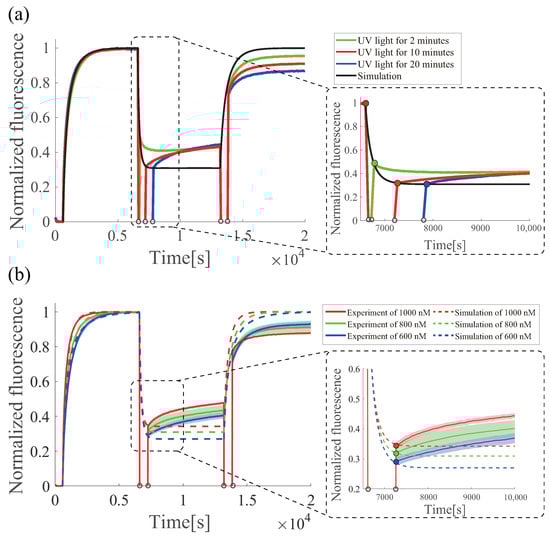 By comparing the experimental and simulation data of the azo-degradation circuit, we can evaluate the effect of azobenzene on the “toehold inhibition” and “toehold emergence” under photoresponsive control. For this purpose, we attempted to estimate the reaction rates of the azo degradation circuit based on experimental data. Although time-course data are needed to estimate the parameters of the ordinary differential equation model, no measurements can be taken during the UV irradiation period (Period III). Hence, the data from Period IV should be employed for parameter estimation. However, a gradual increase was also observed during Period IV after UV irradiation, which may be caused by complex phenomena, including the reaction regarding the state transition from state 1 to state 2. Therefore, to perform valid parameter estimation, only the first time-point data of Period IV were employed. Moreover, to collect the time-series data required for parameter estimation, experiments with different UV irradiation periods (2, 10, and 20 min) in Period III were conducted (Figure 10a), where the initial concentrations of gate D and input I were 800 nM and 500 nM, respectively. Figure 10a shows that the renewable reaction (state 3 to state 4) was not completed in 2 min but almost completed in 10 min because there was no difference in the fluorescence level between 10 and 20 min. By using the four data points from (i) the last time-point of Period II, (ii) the first time point of Period IV in the case of 2 min UV irradiation, (iii) the first time point of Period IV in the case of 10 min UV irradiation, and (iv) the first time point of Period IV in the case of 20 min UV irradiation, we estimated the simulation result based on the ordinary differential equation of azo-degradation with the estimated parameters , , and as illustrated by the black solid line in Figure 10a. The reaction rate in the forward direction was , and in the reverse direction, the fitted values and were in good agreement. To validate the fitting parameters, the fluorescence intensities were measured at different initial concentrations of nM (Figure 10b), where input was nM and UV irradiation period was 10 min. As a result, the reaction rate in the forward direction was at 1000 and 800 nM and at 600 nM. In the reverse direction, the fitted values and were found to be in close agreement (Figure 10a).