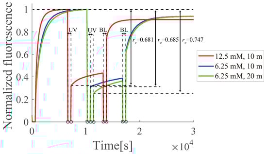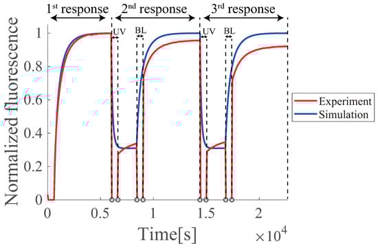 To investigate multiple renewability, two consecutive regenerations were experimentally examined (Figure 11). The second and third responses appeared after the respective UV-BL irradiation period, indicating that multiple regenerations were feasible. However, unlike the ideal simulation result, the regenerated output was reduced by 5.5% on average (5% and 6% for the first and second responses, respectively). This stepwise reduction may be due to fluorescence photobleaching by UV irradiation and time elapsed, in addition to insufficient isomerization to the trans form by BL irradiation, as discussed in Section 6.3.