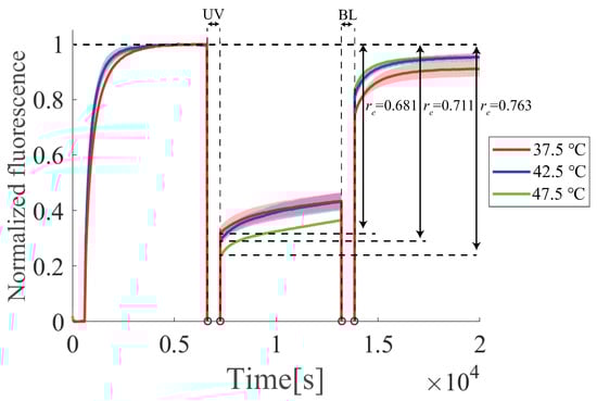 Effect of changing the temperature on azobenzene. The red line is 37.5 C, the blue line is 42.5 C, and the green line is 47.5 C. This result is the average of three times. Colored areas represent the standard deviations.