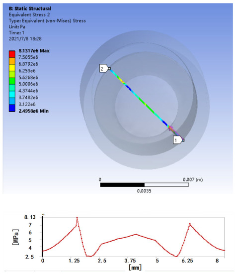 Combined with the working environment of the pressure sensor, and based on ANSYS software, a mechanical simulation of a circular pressure diaphragm with a diameter of 1.5 cm, a thickness of 2 mm, and a material of 0Cr17Ni12Mo2 (AISI316) are carried out. As shown in Figure 2, the stress distribution in the linear part of the diaphragm at the middle diameter of 1 cm is relatively uniform, so that the force part of the FBG is concentrated on the center of the diaphragm as much as possible to obtain a more uniform stress distribution. When fluid pressure acts on the circular diaphragm, the diaphragm is deformed, and the slight stretching and deformation of the FBG will cause the center wavelength of the fiber grating to shift, and the center wavelength shift will reflect the fluid pressure value.