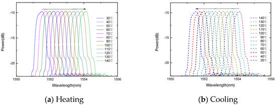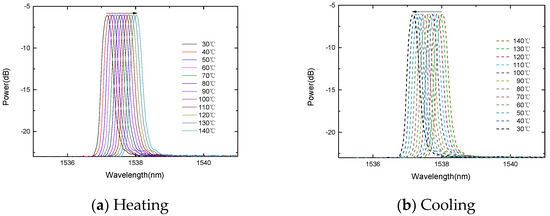 In order to study the temperature response, the FBG is placed in a thermostat. The experiment carried out two temperature rising and falling experiments. The two temperature response curves can overlap well, and the four temperature response curves of the rising and falling temperatures can also overlap well, indicating that the sensor probe has good repeatability, as shown in Figure 4 and Figure 5. During the heating process, the center wavelength of the FBG decreases linearly with the increase in temperature. Similarly, during the cooling process, the center wavelength of the fiber grating decreases linearly with the decrease in temperature.