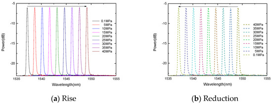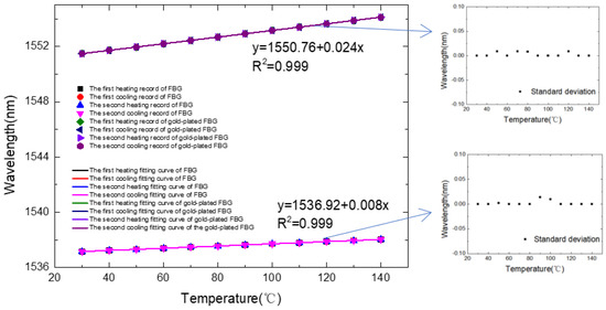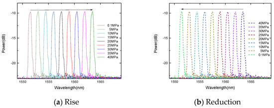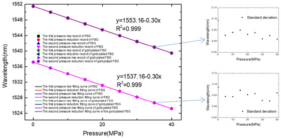 Table 2 is the experimental data collected under the different temperature environments, and Figure 10 is the FBG pressure response graph. The experimental results show that the pressure response sensitivity of the FBG and gold-plated FBG is similar, which is 0.3 nm/MPa at 0.1 MPa to 40 MPa. The sensor has good linearity, and the response curves of the two pressure rise-and-fall processes can be well overlapped. Combining the resolution of the spectrometer and the sensors’ sensitivity, the gold-plated FBG has a temperature resolution of 0.8 °C. Based on the measured wavelength, sensitivity coefficient, and standard pressure value, the maximum temperature error is 0.4 MPa, so the measurement accuracy can be obtained through the accuracy measurement equation as follows: δ = 100% − 0.4/(40 − 0.1) × 100% = 99.0%.