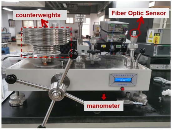 A pressure measurement system was designed, as shown in Figure 7. The probe was placed at the impulse tube of the pressure gauge. As the external pressure changes, the pressure diaphragm is deformed, and the grating is also deformed, which in turn causes the pitch of the grating to change. Therefore, the FBG pressure sensing system can demodulate the spectrum corresponding to the FBG at different pressure. The pressure source used in the experiment was the CW-600T pressure calibrator, which was connected with the sensor by the threaded interface (M20 × 1.5). The sensor, coupler, ASE light source, and demodulation system were connected to each other by optical fibers. The pressure gauge for monitoring the pressure source of the fiber grating pressure sensor was produced by the Xi’an Instrument Factory, with a range of 0–60 MPa and an accuracy of 0.01-level standard pressure gauge. The ASE light source emitted a beam of broadband light that entered the sensor probe through the coupler, and the modulation system demodulated the center wavelength of the FBG. The circular diaphragm was deformed due to the pressure, and the center wavelength at this time was less than the unpressurized center wavelength.